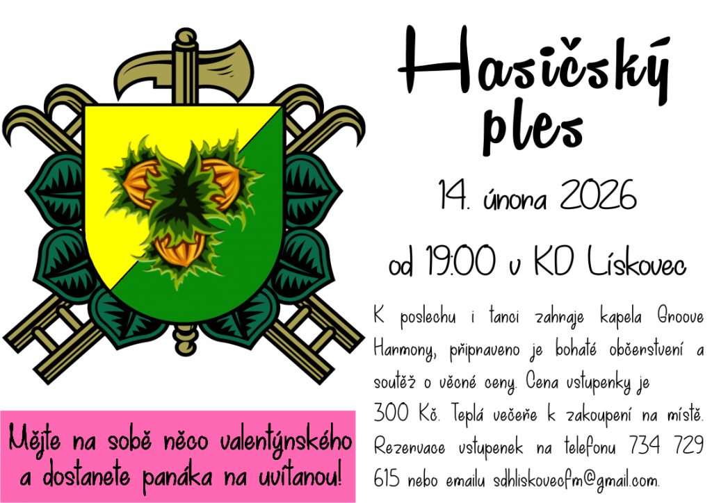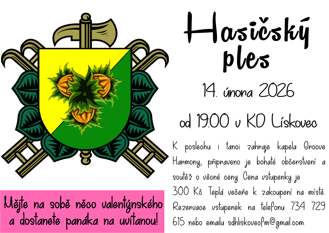 V sobotu 14. února 2026 pořádá SDH Lískovec od 19:00 v Kulturním domě v Lískovci Hasičský ples. K poslechu i k tanci bude hrát kapela Groove Harmony. A kdo bude mít na sobě něco valentýnského, dostane u vstupu panáka na uvítanou. Na místě bude k zakoupení teplá večeře z vařečky našeho mistra kuchaře.